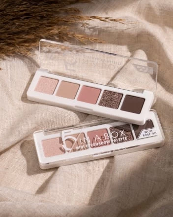Mit der Catrice 5 In A Box Mini Eyeshadow Palette Soft Rose Look 020 haben Sie den perfekten Augen-Make-up-Look immer dabei. Die Palette ist frei von Mikroplastikpartikeln und enthält 5 Shades, mit denen sich in Sekundenschnelle wunderschöne, komplette Eye-Make-up-Looks kreieren lassen. Die hochpigmentierten Nuancen mit wertvollem Rosenöl sind super soft und lassen sich so ganz einfach verblenden.