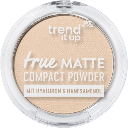 Das Puder True Matte Compact Powder sand 050 von trend !t up hat eine seidig weiche Textur und verleiht dem Teint ein perfektes Aussehen und ein samtig schönes Hautgefühl. Die glättenden Inhaltsstoffe Hyaluron und Bio-Hanfsamenöl schenken der Haut ein angenehmes und weiches Gefühl.