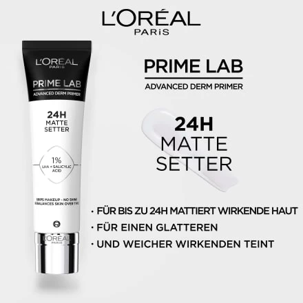 Der Prime Lab up to 24h Matte Setter Primer von L’Oréal Paris sorgt für bis zu 24 h für einen mattiert wirkenden Teint und verlängert die Haltbarkeit Ihres Make-ups. Die Formel mit LHA und Salicylsäure verbessert das Hautbild im Laufe der Zeit. Das Ergebnis: Ein glatter und weicher wirkender Teint. Die ultra-leichte Formel sorgt den ganzen Tag für einen angenehmen Tragekomfort – ganz ohne einen fettigen Film zu hinterlassen.