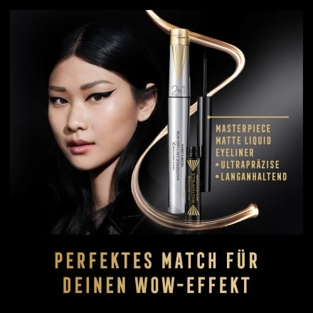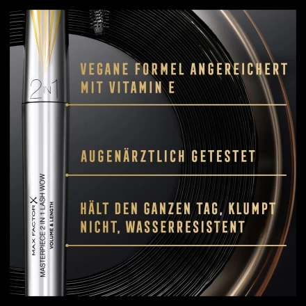 Mit der Mascara Masterpiece 2in1 Lash Wow Black von Max Factor verwandeln Sie Ihre Wimpern mit nur einem Dreh. Dank ihrer einzigartigen drehbaren 2in1 Mascara-Bürste können Sie Ihren individuellen Look wählen. Entweder maximale Länge und perfekte Definition oder maximales Volumen und atemberaubender Schwung. Auch die feinen Härchen in den Augenwinkeln werden spielend erreicht. Die Mascara lässt sich leicht auftragen, ohne zu verklumpen oder zu krümeln, und hält den ganzen Tag, ohne zu verwischen – auch, wenn der Abend mal etwas länger wird. Die Max Factor Masterpiece 2in1 Lash Wow Mascara ist augenärztlich getestet und eignet sich hervorragend auc h für empfindliche Augen und Kontaktlinsenträgerinnen – für einen verführerisch intensiven Blick.